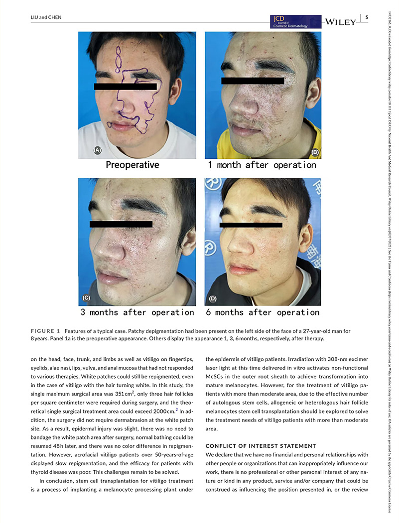 此外,毛囊黑素细胞干细胞移植治疗白癜风的方法无需磨皮取皮,因此创伤性小恢复也比较快,更不会担心留瘢痕,安全性高,且不受治疗部位和患者年龄的限制,适应范围广泛。这项新技术做到了很好的弥补了传统黑素细胞移植的局限性,给更多患者提供了全新的治疗选择,这些都是有临床医学出处的,并且得到证实。相关《美容皮肤病学杂志》这篇SCI论文的内容,大家可以下滑详细了解↓↓↓
